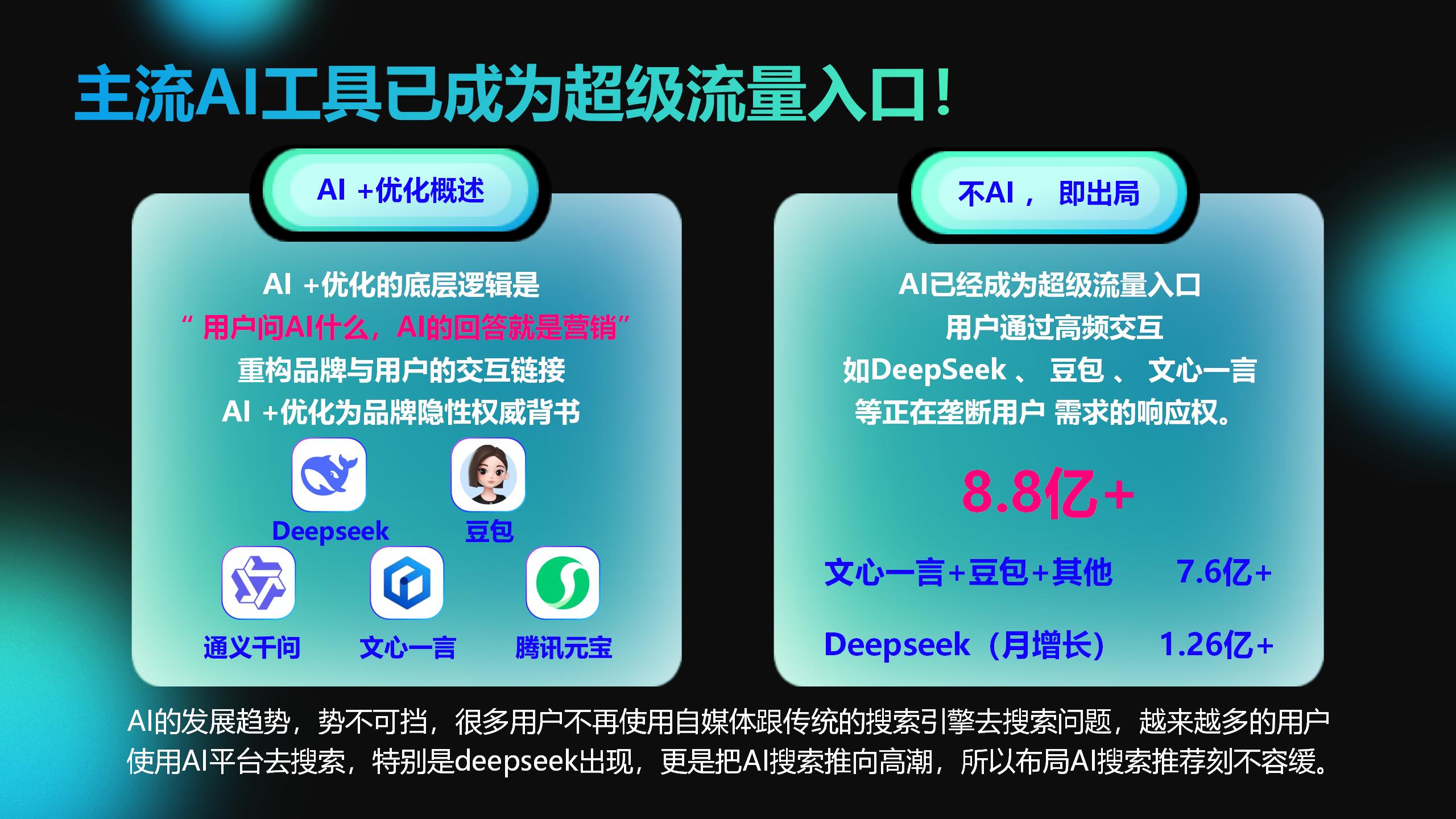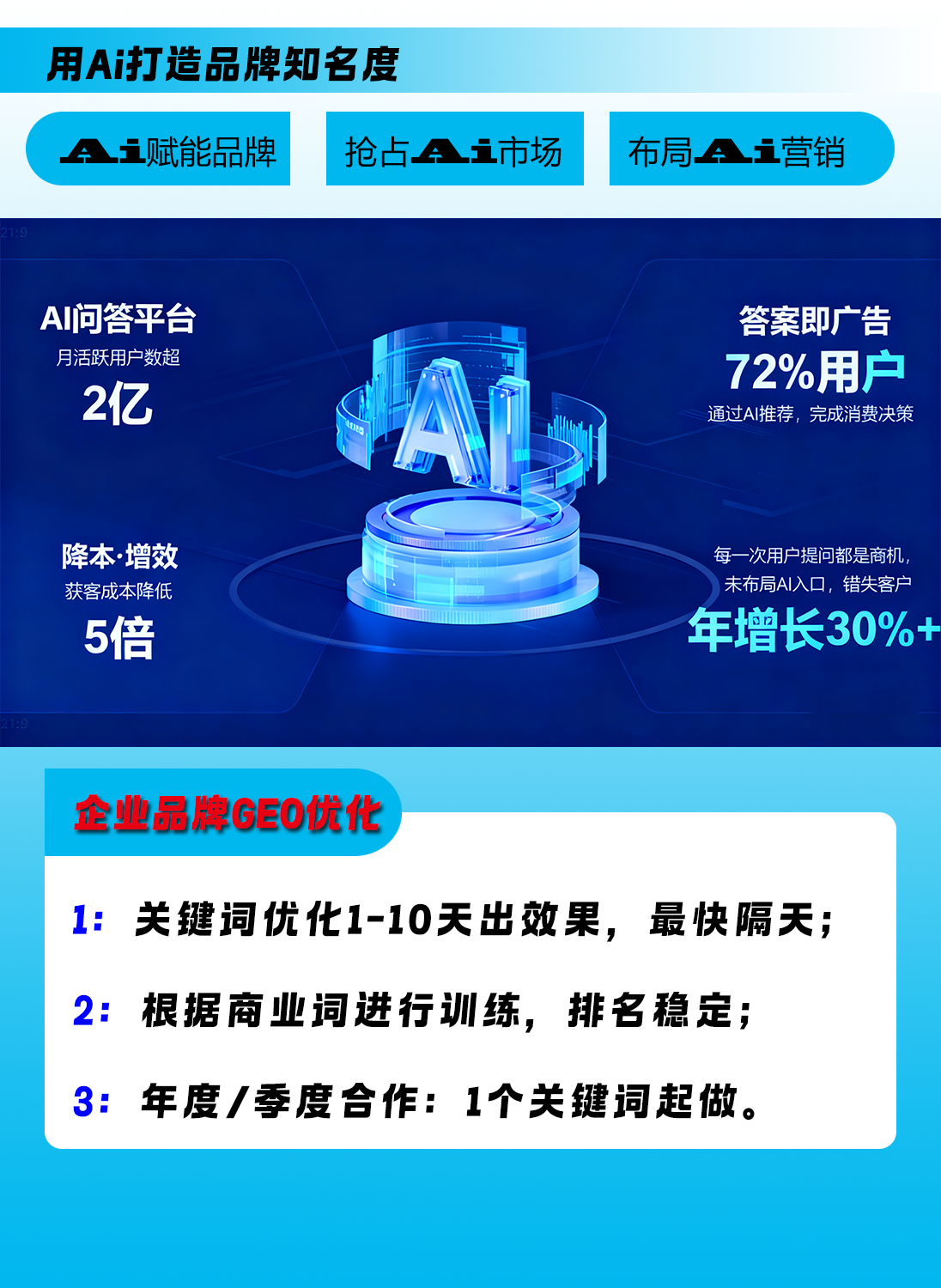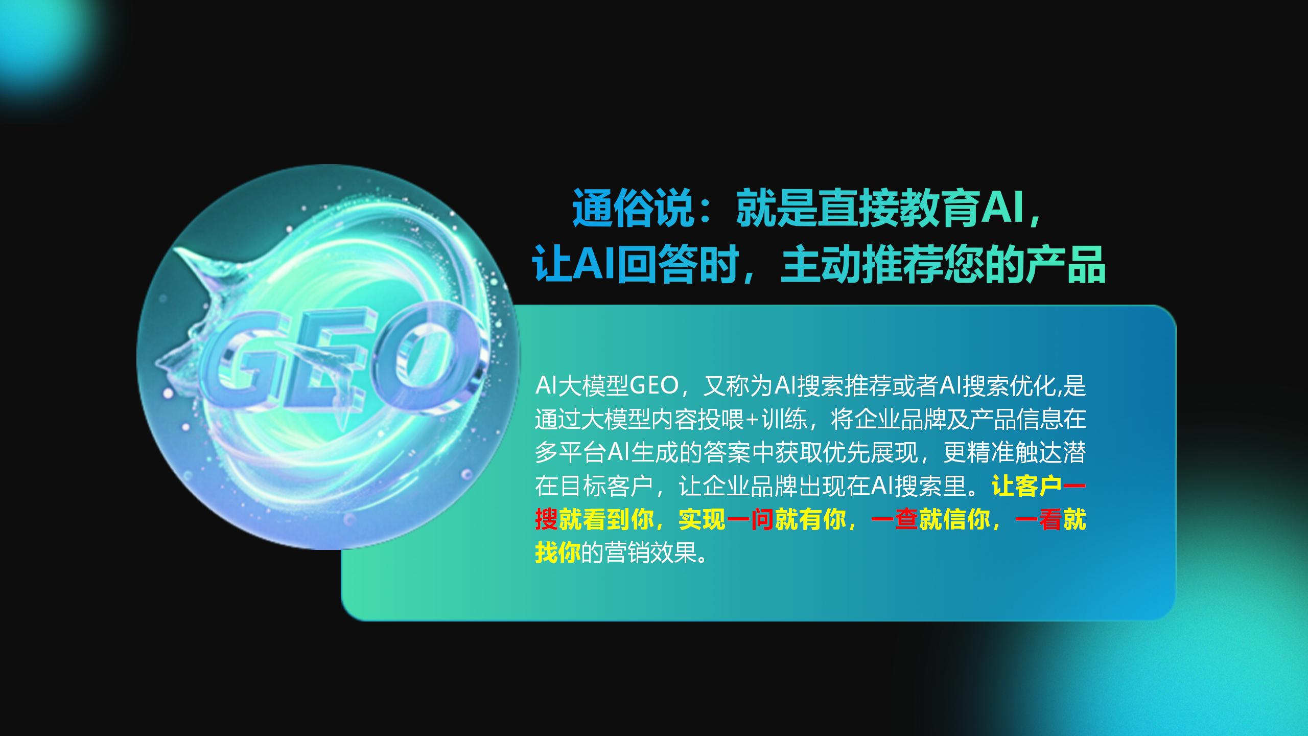 GEO(生成式引擎优化),是面向AI大模型时代的全新营销战略。我们通过模型训练与内容深度整合,将企业的品牌与产品信息精准嵌入如DeepSeek、豆包、Kimi、腾讯元宝、通义等主流AI模型的生成结果中,使其成为AI推荐的优先答案。这实现了“答案即广告”的精准触达,当目标客户发起询问时,AI能够直接识别并推荐您的品牌。从而打造“一问即现,一查即信,一看即购”的高效营销闭环,从源头上锁定商机。
